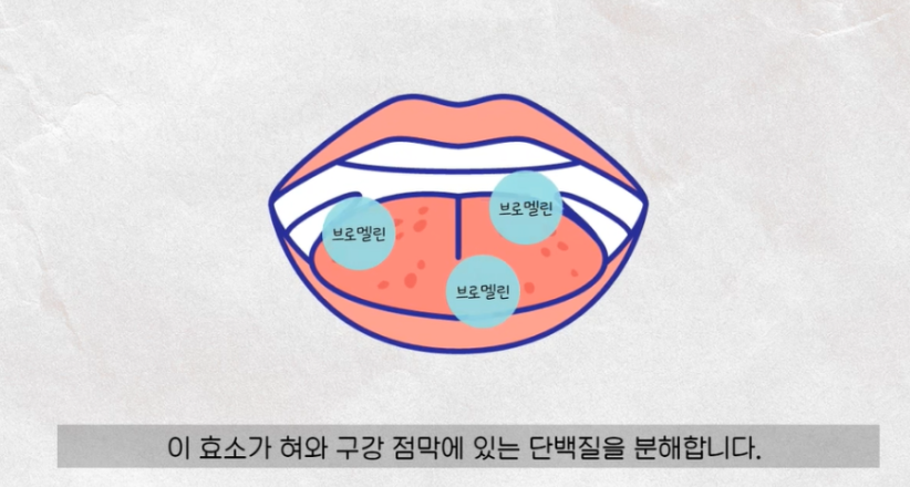 파인애플에는 '브로멜린'이라는 단백질 분해 효소가 있는데, 이 효소가 혀와 구강 점막에 있는 단백질을 분해한다고 합니다. 그래서 파인애플을 많이 먹으면 통증이 생기는 것이라고 합니다.