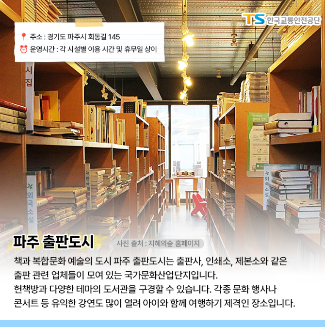 책과 복합문화 예술의 도시 출판도시는 출판사, 인쇄소, 제본소와 같은 출판 관련 업체들이 모여 있는 국가문화산업단지입니다. 헌책방과 다양한 테마의 도서관을 구경할 수 있습니다. 각종 문화 행사나 콘서트 등 유익한 강연도 많이 열려 아이와 함께 여행하기 제격인 장소입니다.