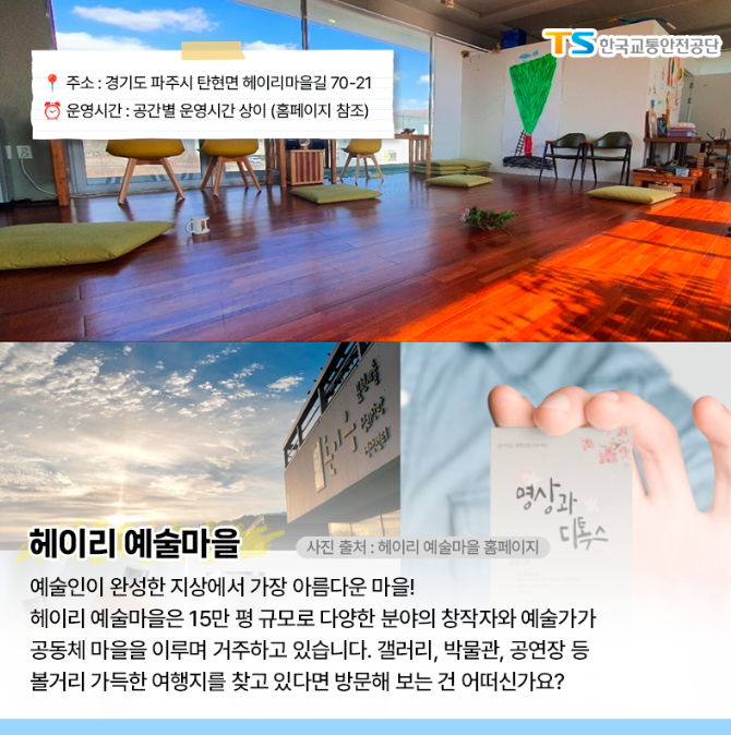 예술인이 완성한 지상에서 가장 아름다운 마을! 헤이리 예술마을은 15만 평 규모로 다양한 분야의 창작자와 예술가가 공동체 마을을 이루며 거주하고 있습니다. 갤러리, 박물관, 공연장 등 볼거리 가득한 여행지를 찾고 있다면 방문해 보는 것도 좋을 것 같습니다.