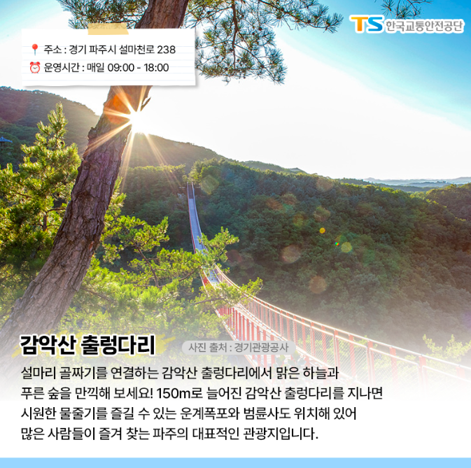 150m로 늘어진 감악산 출렁다리를 지나면 시원한 물줄기를 즐길 수 있는 운계폭포와 범륜사도 위치해 있어 많은 사람들이 즐겨 찾는 파주의 대표적인 관광지입니다.