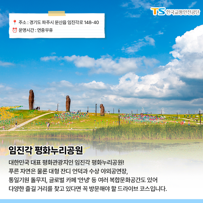 대한민국 대표 평화관광지인 임진각 평화누리공원! 푸른 자연은 물론 대형 잔디 언덕과 수상 야외공연장, 통일기원 돌무지, 글로벌 카페 '안녕' 등 여러 복합문화공간도 있어 다양한 즐길 거리를 찾고 있다면 꼭 방문해야 할 드라이브 코스입니다.