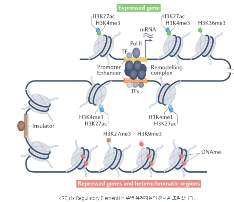 또한, DNA가 생명의 청사진인 유전자들을 포함하고 있다고 했는데, 30억 염기쌍으로 이뤄진 DNA 중에서 유전자인 부분은 고작 5~10%에 불과합니다. 나머지 부분은 유전정보가 번역되어 단백질로 되지 않는, 비번역 부위인 것입니다. 이 비번역 부위의 기능들은 다 밝혀지지 않았지만, 그중에서 cRE(cis-Regulatory Element)라고, 주변 유전자들의 전사체를 조절하는 역할을 담당하는 부분이 주목받고 있습니다. 좀 전 전사체(RNA)가 중요하다고 했는데, cREs가 유전자 발현을 억제한다면 전사체가 잘 생성되지 않을 것이고, 해당 유전자는 제 기능을 잘 못하게 되는 것입니다.