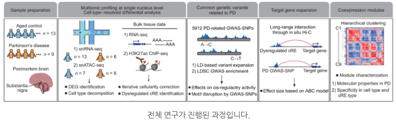해당 연구는 전사체 분석으로 파킨슨병 특이적 유전자를 프로파일링하고, 조절되지 않은 cRE가 해당 유전자들의 발현에 영향을 미침을 밝히고, 그로 인해 발현에 변화가 생긴 유전자들을 모듈로 묶어, 파킨슨병에 걸렸을 시 어떤 세포에서 유전자들에 변화가 생겨 파킨슨병이 나타나는지 분자 메커니즘까지 확인했습니다.
