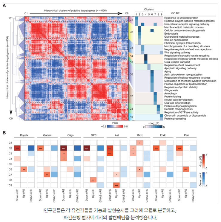 그리고 각 표적 유전자가 어떤 세포에 영향을 미치는지도 알아냈다고 합니다. 각 유전자의 도파민성 뉴런, 희소돌기세포, 성상세포, 미세아교세포 등에서 활성화됨을 알아 여러 종류의 세포들의 변화가 협동적으로 파킨슨병을 일으킴을 볼 수 있었다고 합니다. 또한, 파킨슨병 유전자들을 지질대사 관여 단백질 접힘 관여 등 여러 역할에 따라 유전자들을 9개의 모듈(C1~C9)로 분류하고, cRE의 조절문제가 어떻게 특정 모듈의 유전자들, 즉 특정 세포기능에 영향을 주는지를 살펴보았다고 합니다.