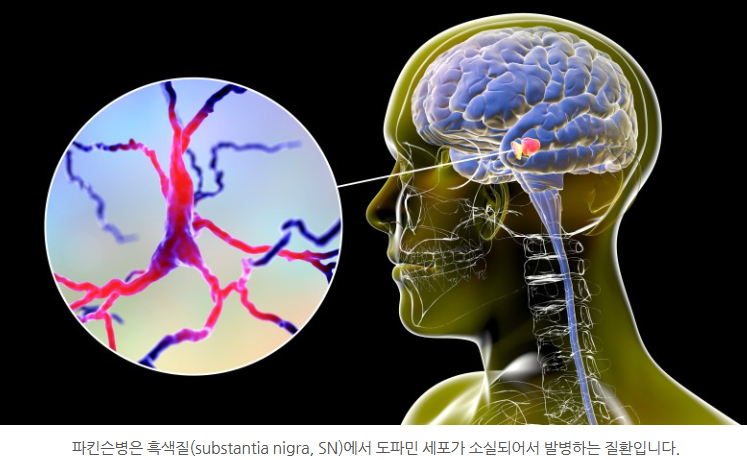 주위에서 파킨슨병에 대해 들어보신 적이 있으신가요? 파킨슨병에 걸리면 손 떨림, 근육 경축, 보행 이상, 구부정한 자세 등 동작이 느려지는 다양한 운동증상이 나타납니다. 60세 이상 인구의 1.2% 이상에서 파킨슨병이 나타날 만큼 파킨슨병은 매우 흔한 퇴행성 뇌 질환입니다. 파킨슨병은 중뇌 흑색질에 존재하는 도파민 분비 신경세포가 죽어서 발병하게 됩니다. 흑색질에서 만들어진 도파민은 선조체라는 뇌 부위에 작용하여 신체의 운동기능을 조절하는데, 흑색질의 도파민 세포가 없어지면 운동기능이 떨어지고 파킨슨병 증상이 나타나게 됩니다. 인구 고령화가 나타남에 따라 그 심각성이 점점 커지고, 많은 연구자의 관심을 받고 있습니다.
