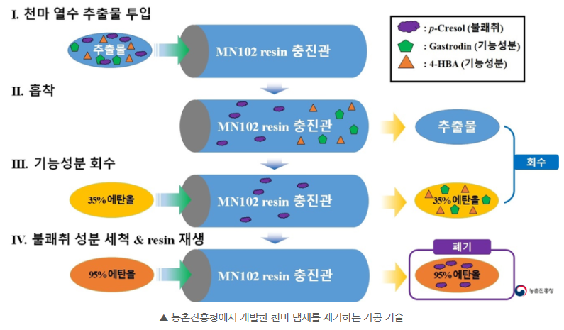 그래서 농촌진흥청은 천마 추출물을 합성흡착제에 통과시켜 기능 성분과 냄새 성분이 흡착제에 달라붙게 한 뒤, 에탄올을 이용해 기능 성분만 분리하는 기술을 개발해 완벽 제거했다고 합니다.