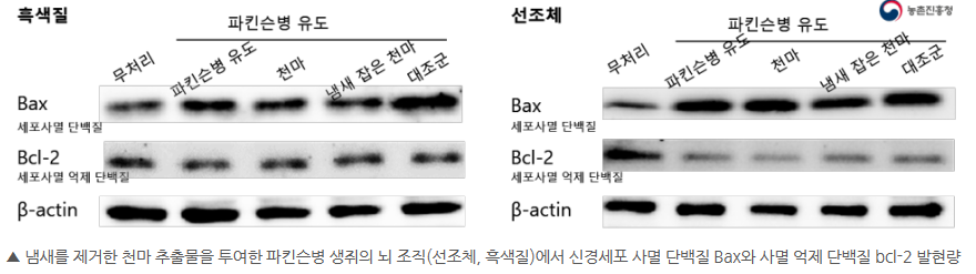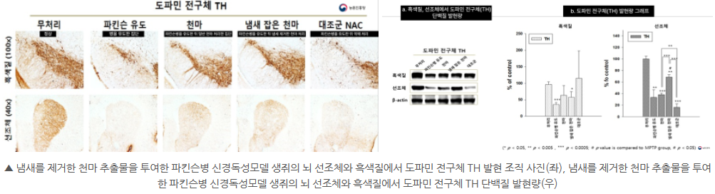 동물실험에서는 냄새 제거 천마 추출물을 투여한 실험 쥐의 뇌 조직(선조체, 흑색질)에서 도파민 전구체(TH)의 발현이 30~50% 증가했다고 합니다. 뇌신경을 죽이는 단백질(Bax)은 30% 억제되었다고 합니다.