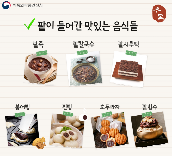 팥이 들어간 다양한 음식 중에서도 역시, 동지하면 동지팥죽을 빼놓을 수 없습니다. 동지팥죽 레시피를 보고 동짓날 함께 만들어보시길 추천합니다. 참고로 팥죽처럼 점도가 높은 죽이나 수프류는 소금의 양이 조금 덜 들어가더라도 덜 싱겁게 느껴지기 때문에 나트륨 섭취를 줄일 수 있는 음식입니다.