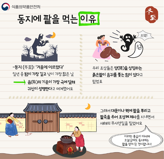 동지는 '겨울에 이르렀다'는 뜻으로, 일 년 중 밤이 가장 길고 낮이 가장 짧은 날입니다. 우리 조상들은 밤이 가장 긴 날에는 음의 기운이 가장 극에 달해 귀신이 성행한다고 여겼다고 합니다. 양을 상징하는 붉은팥은 그러한 음귀를 쫓는 힘이 있다고 믿었다고 합니다. 따라서 예로부터 동짓날에는 팥죽을 쑤어 조상께 제사를 지내고 대문이나 벽에 뿌려 귀신을 쫓아 새해의 무사안일을 빌던 풍습이 전해져 내려왔다고 합니다. 이런 동지의 전통이 오늘날까지 이어져 동지에 팥을 찾아 먹게 된 것이라고 합니다.