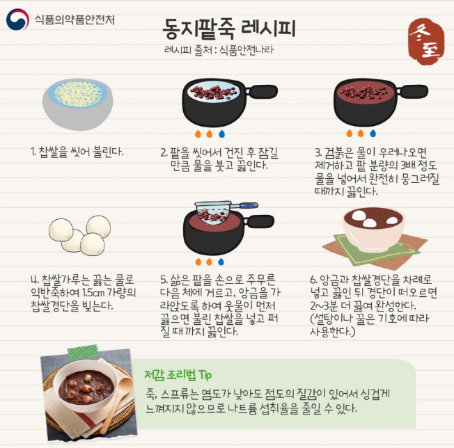 팥이 들어간 다양한 음식 중에서도 역시, 동지하면 동지팥죽을 빼놓을 수 없습니다. 동지팥죽 레시피를 보고 동짓날 함께 만들어보시길 추천합니다. 참고로 팥죽처럼 점도가 높은 죽이나 수프류는 소금의 양이 조금 덜 들어가더라도 덜 싱겁게 느껴지기 때문에 나트륨 섭취를 줄일 수 있는 음식입니다.