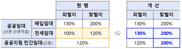 별도 맞벌이 기준이 없었던 공공지원 민간임대 신혼부부 특공 유형에 대해서는 맞벌이 소득 기준(200%)을 새로 도입한다고 합니다.
