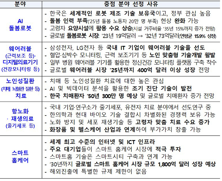 특히 "정부는 정통실버산업과 첨단기술이 융합된 Age-Tech 중에서 돌봄로봇, 웨어러블 및 디지털의료기기, 노인성질환 치료, 항노화 및 재생의료, 스마트 홈 케어를 5대 중점 분야로 선정해 집중 육성할 계획"이라고 밝혔다고 합니다.