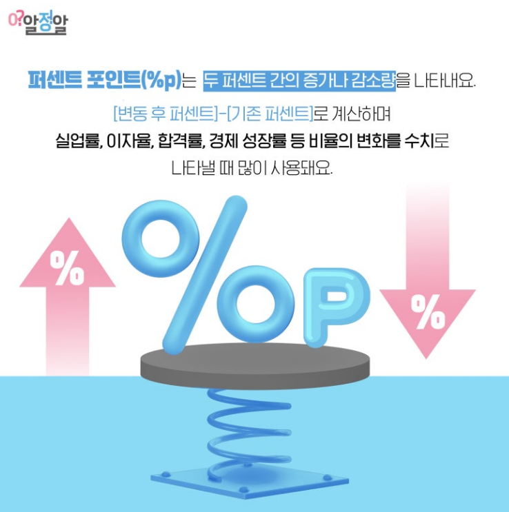 (변동 후 퍼센트)-(기존 퍼센트)로 계산하며 실업률, 이자율, 합격률, 경제 성장률 등 비율의 변화를 수치로 나타날 때 많이 사용합니다.