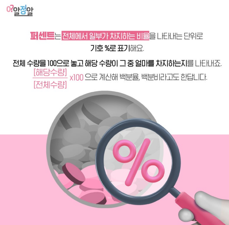 퍼센트(%)는 전체에서 일부가 차지하는 비율을 나타내는 단위로 기호 %로 표기합니다.