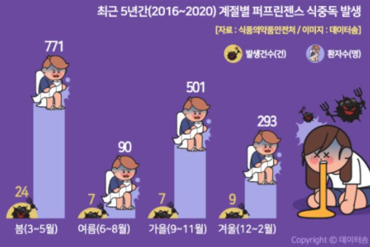 퍼프린젠스 식중독은 발생 현황을 보면 최근 5년 간 총 47건의 식중독 사고로 1,655명의 환자가 발생하였고, 음식 관리에 소홀하기 쉬운 봄, 가을, 겨울 순으로 발생이 많았다고 합니다.