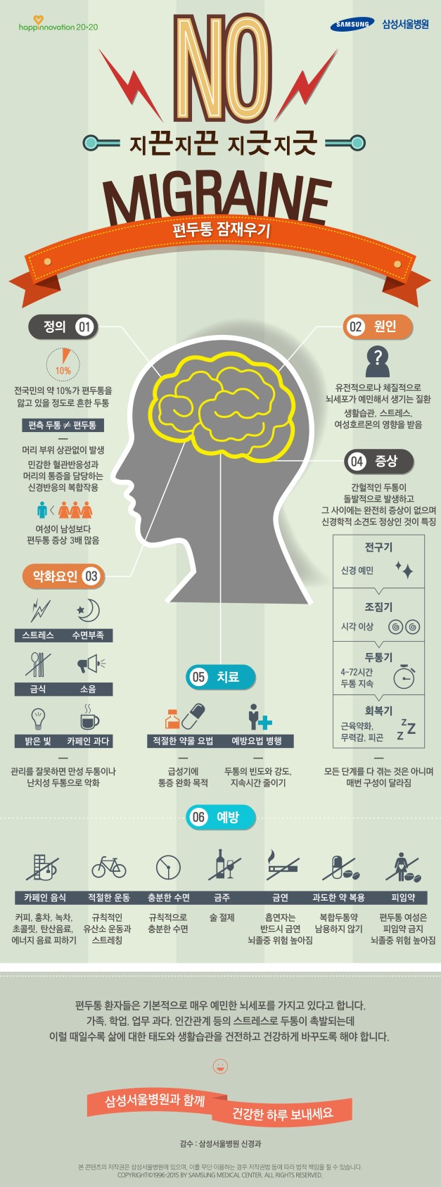 또, 환자는 생활 속에 존재하는 유발인자를 살피고, 규칙적인 운동과 식사, 적절한 수면 등의 생활 관리로 두통을 예방해야 한다고 합니다.