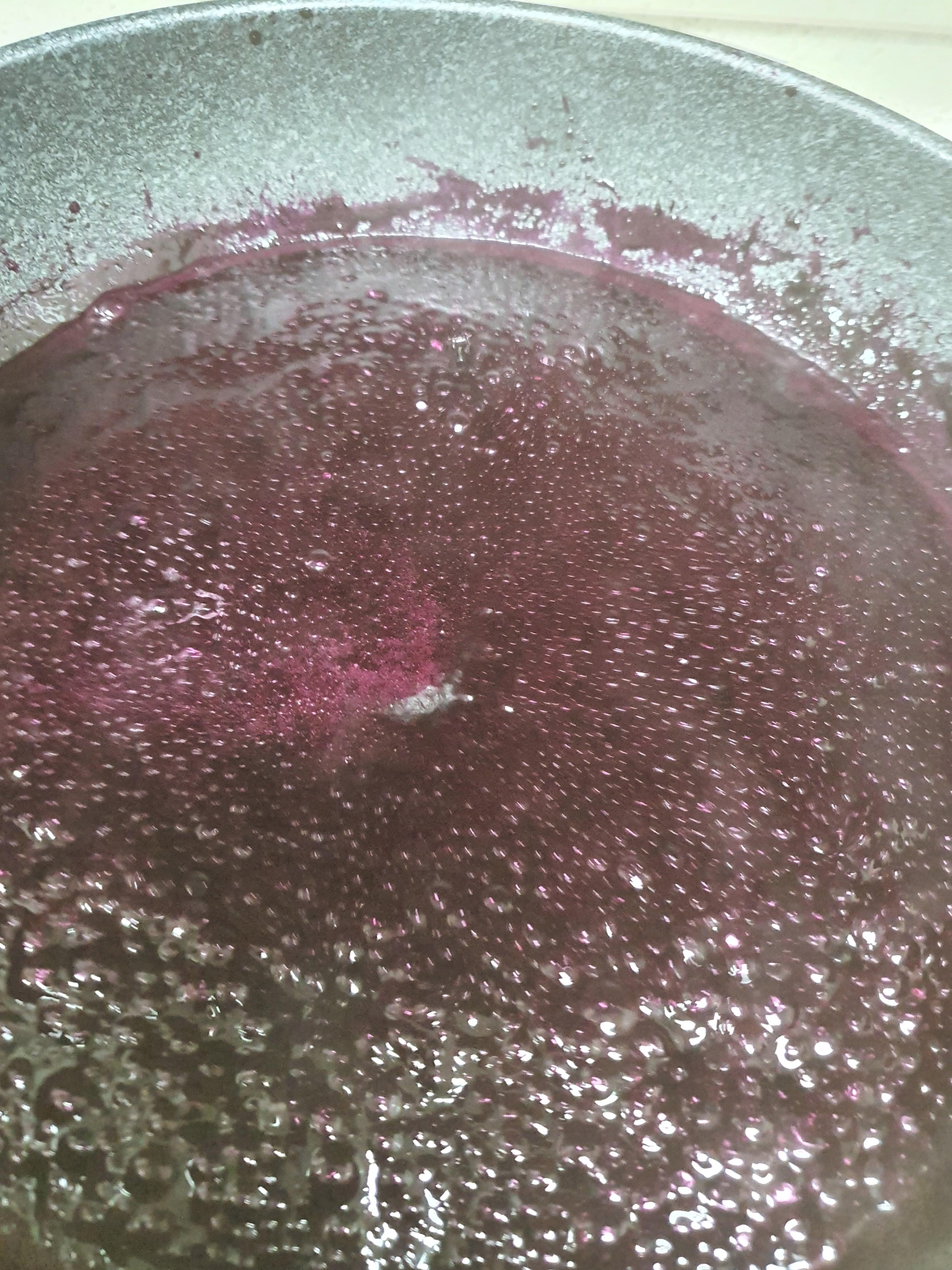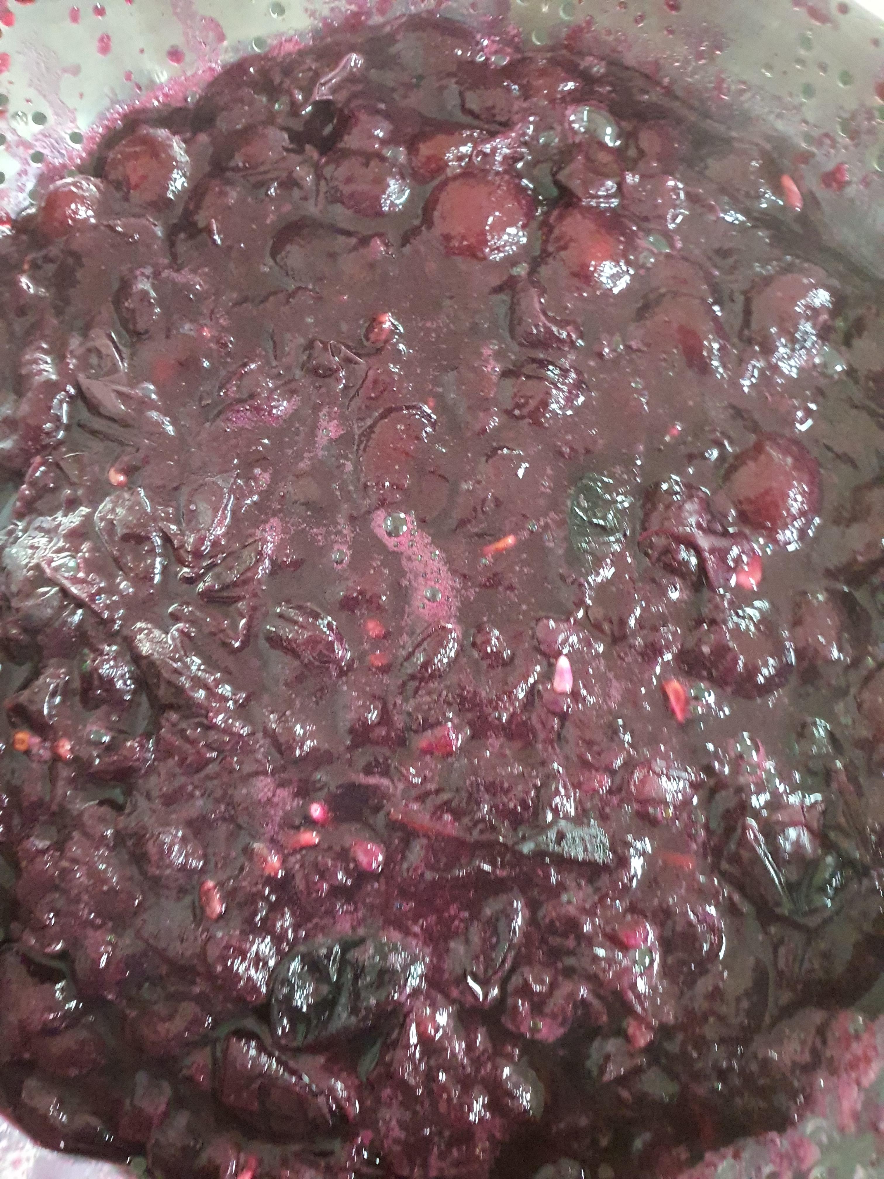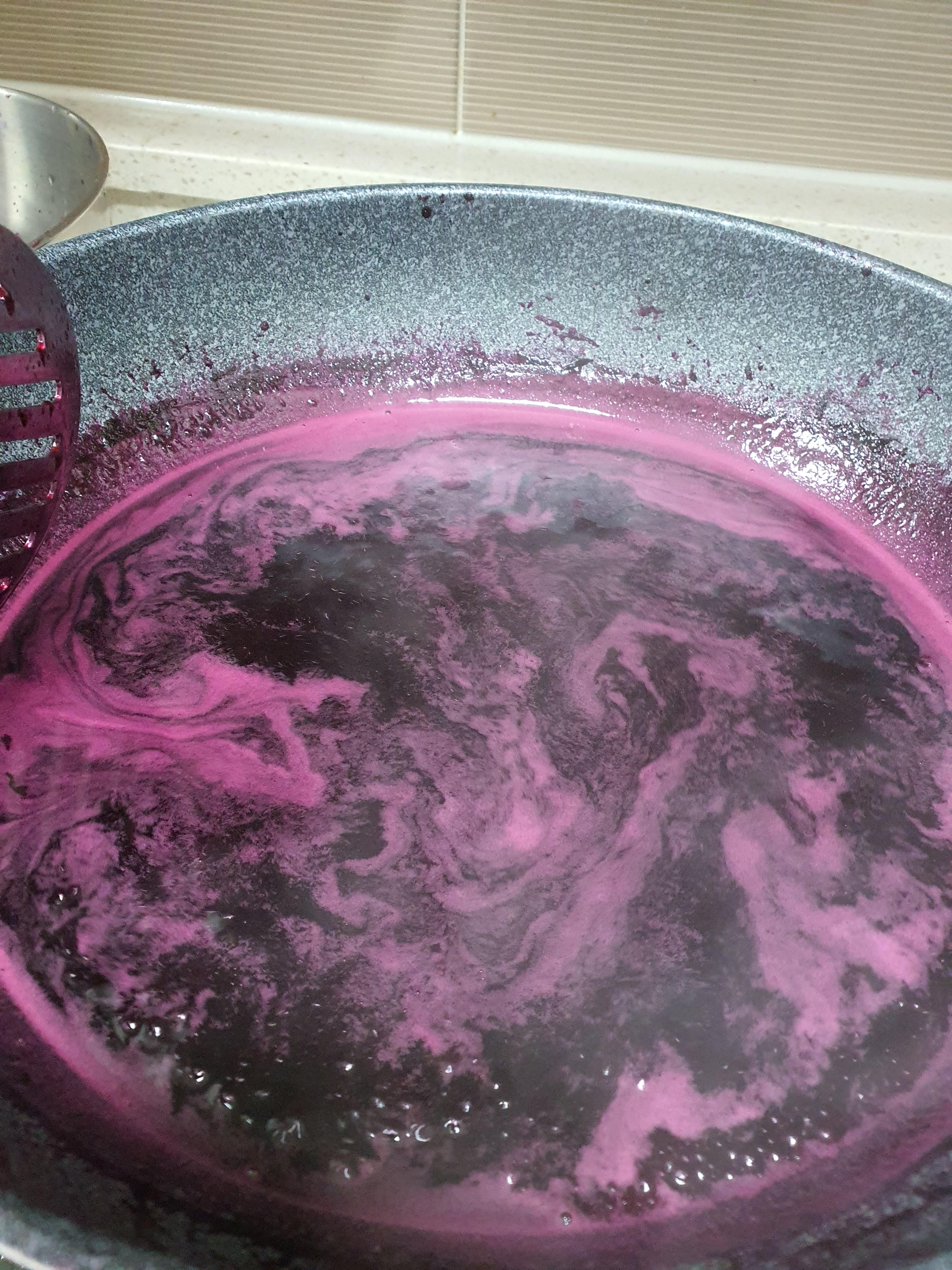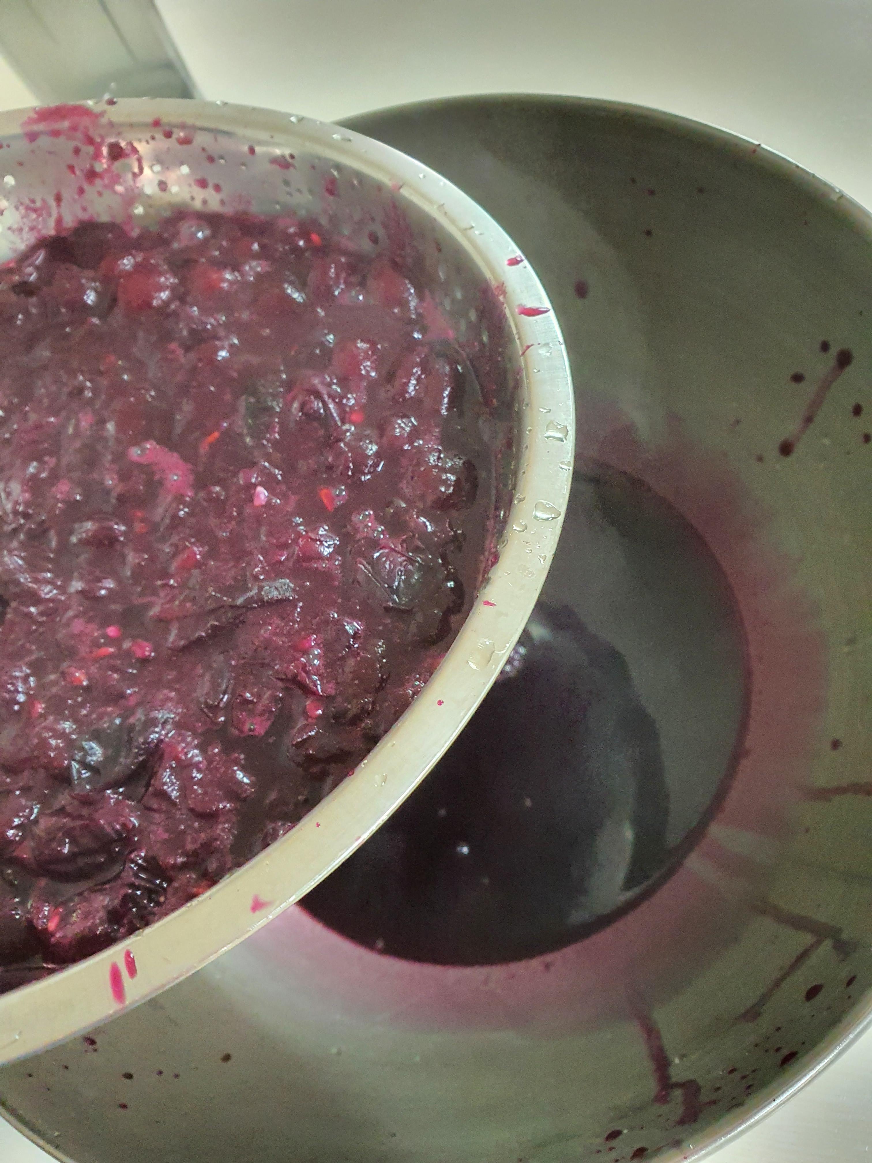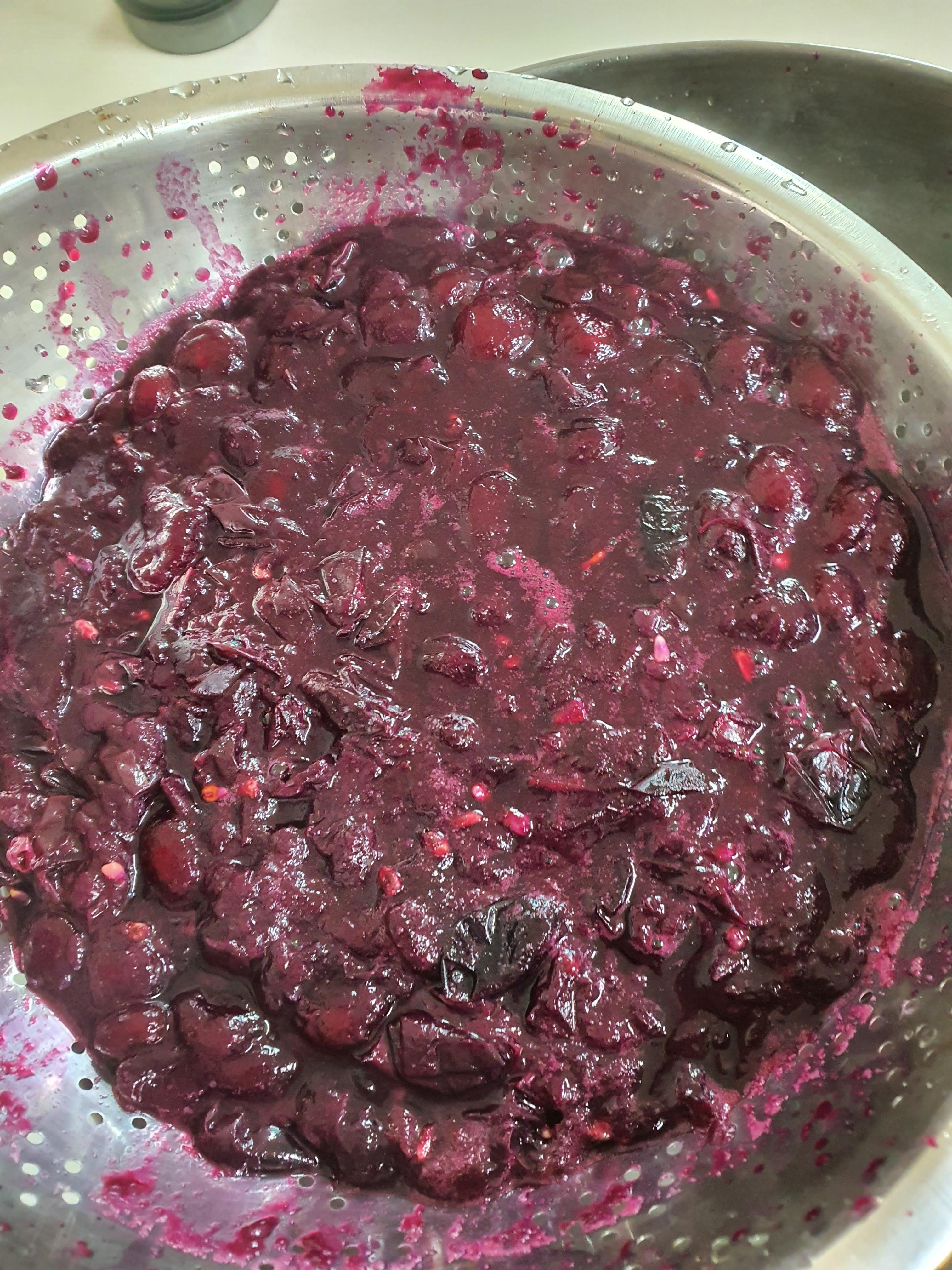 끓이는 동안 구멍이 숭숭 뚫린 조리 도구를 이용해 포도알을 눌러주면 이렇게 순식간에 포도물이 생깁니다.