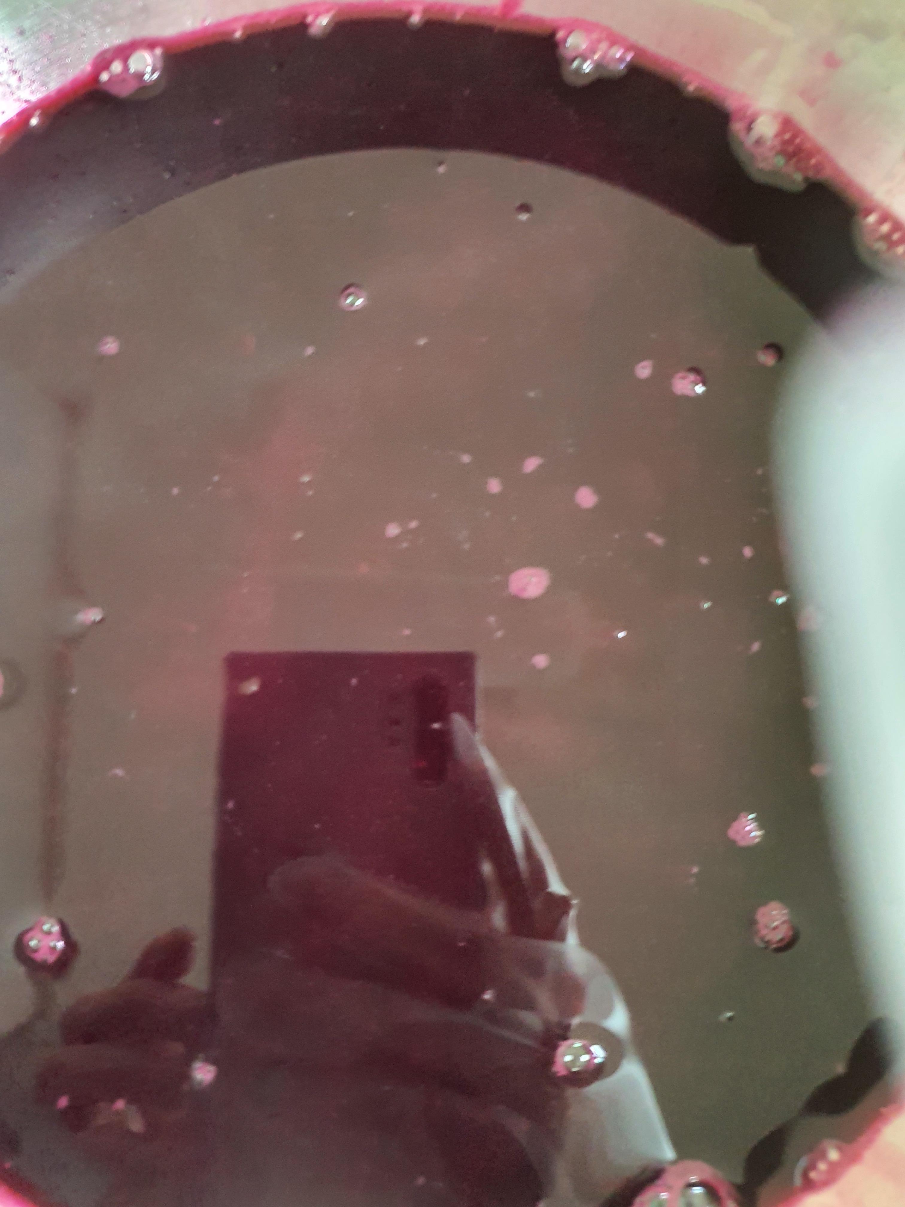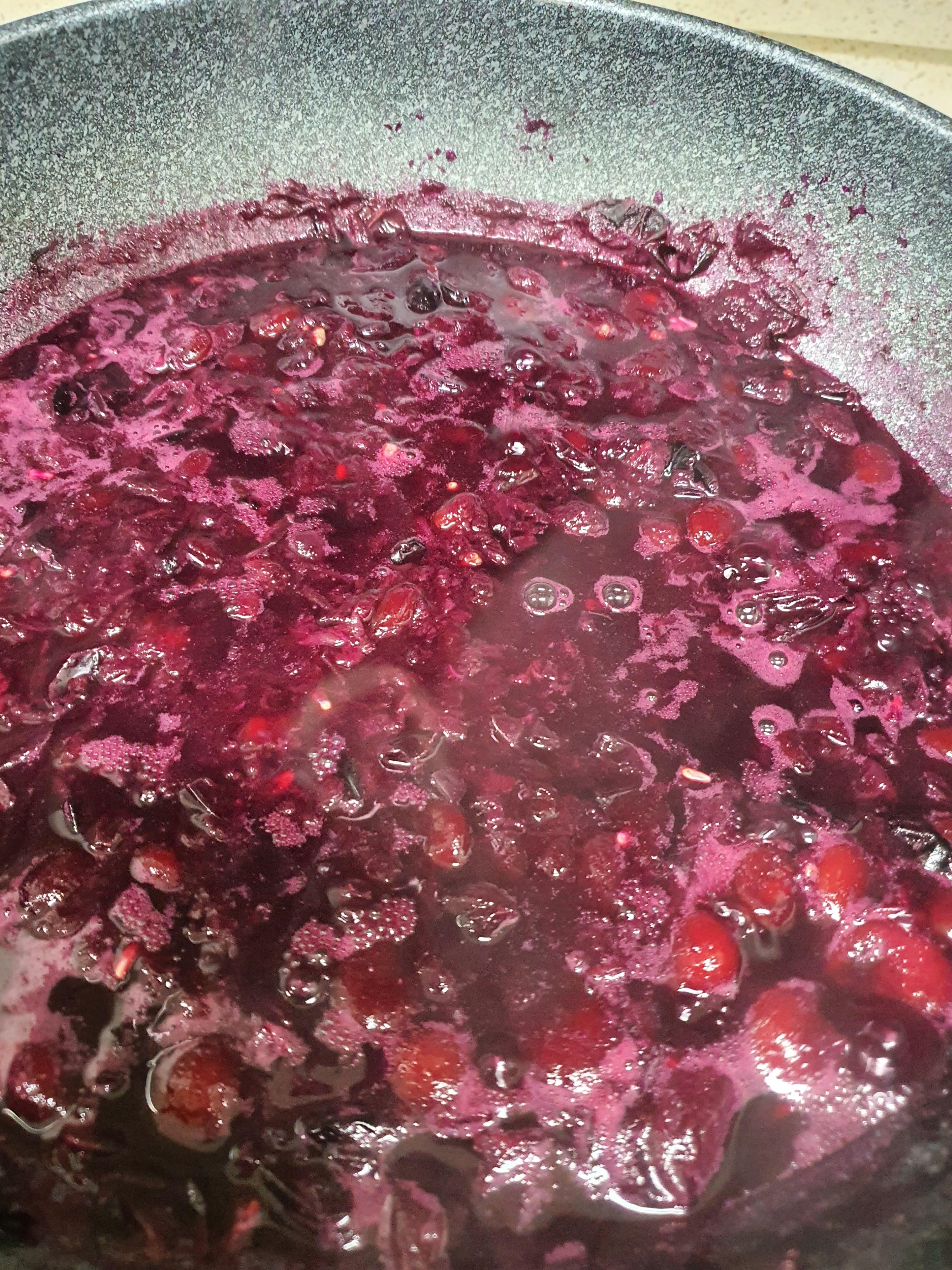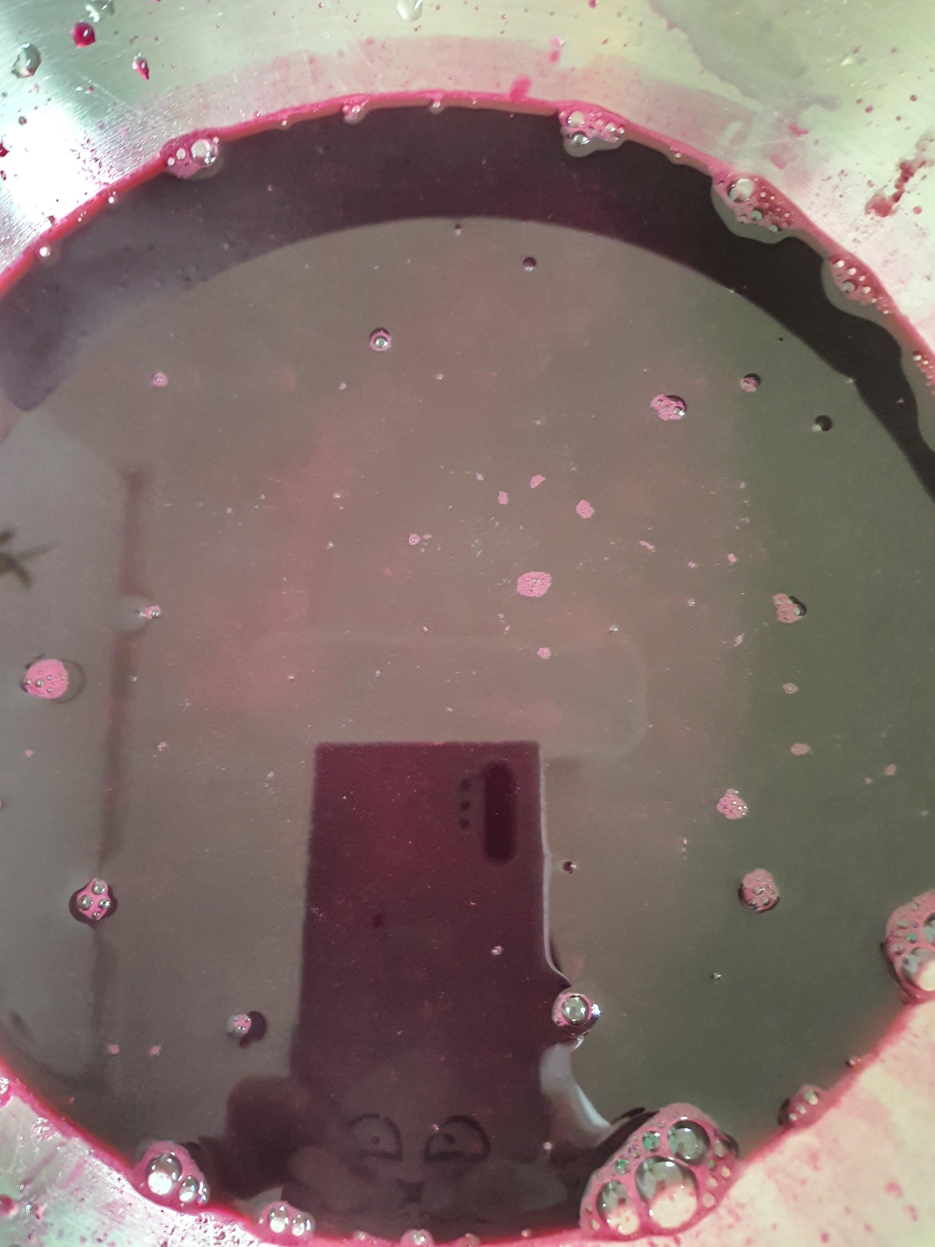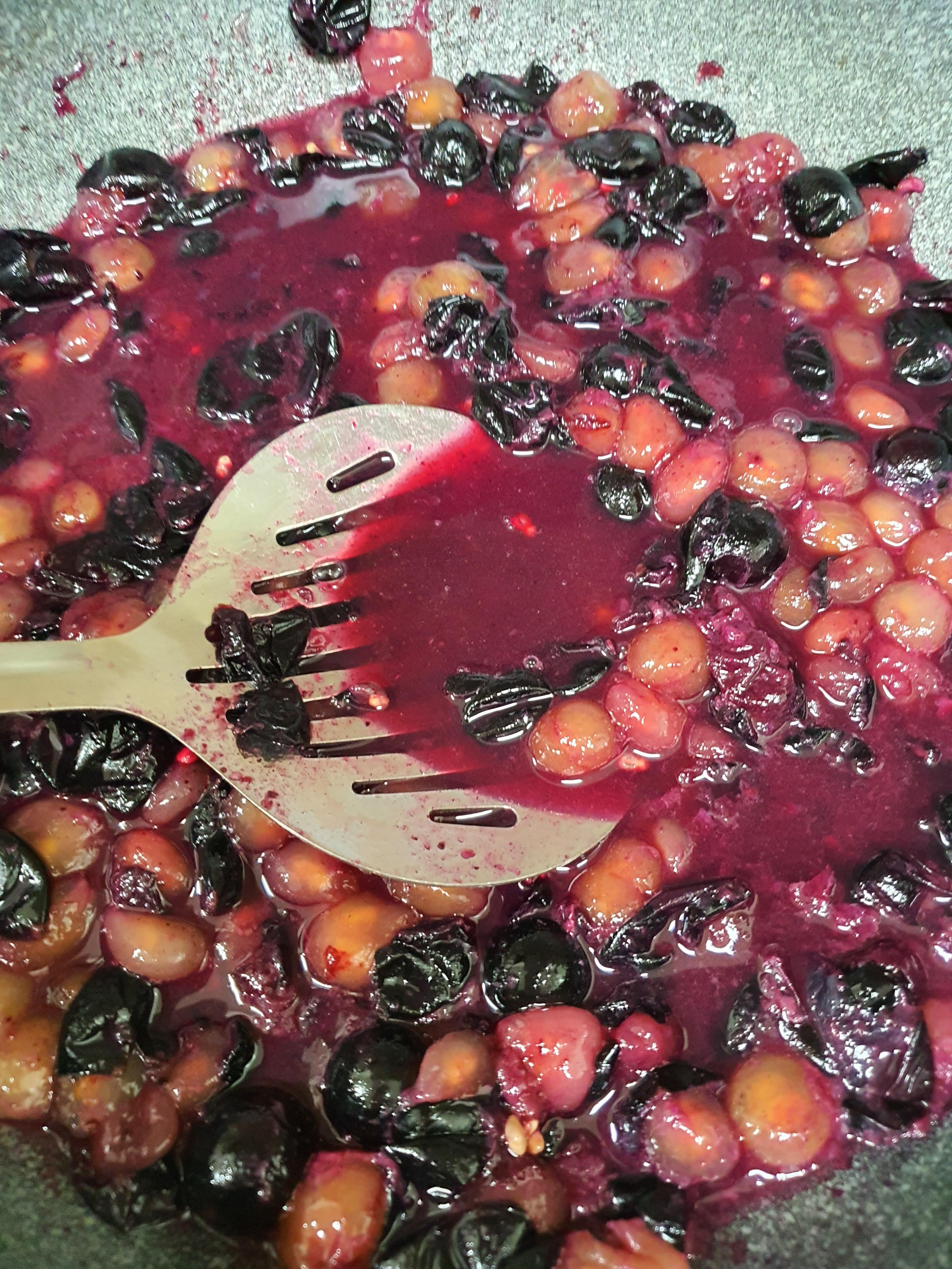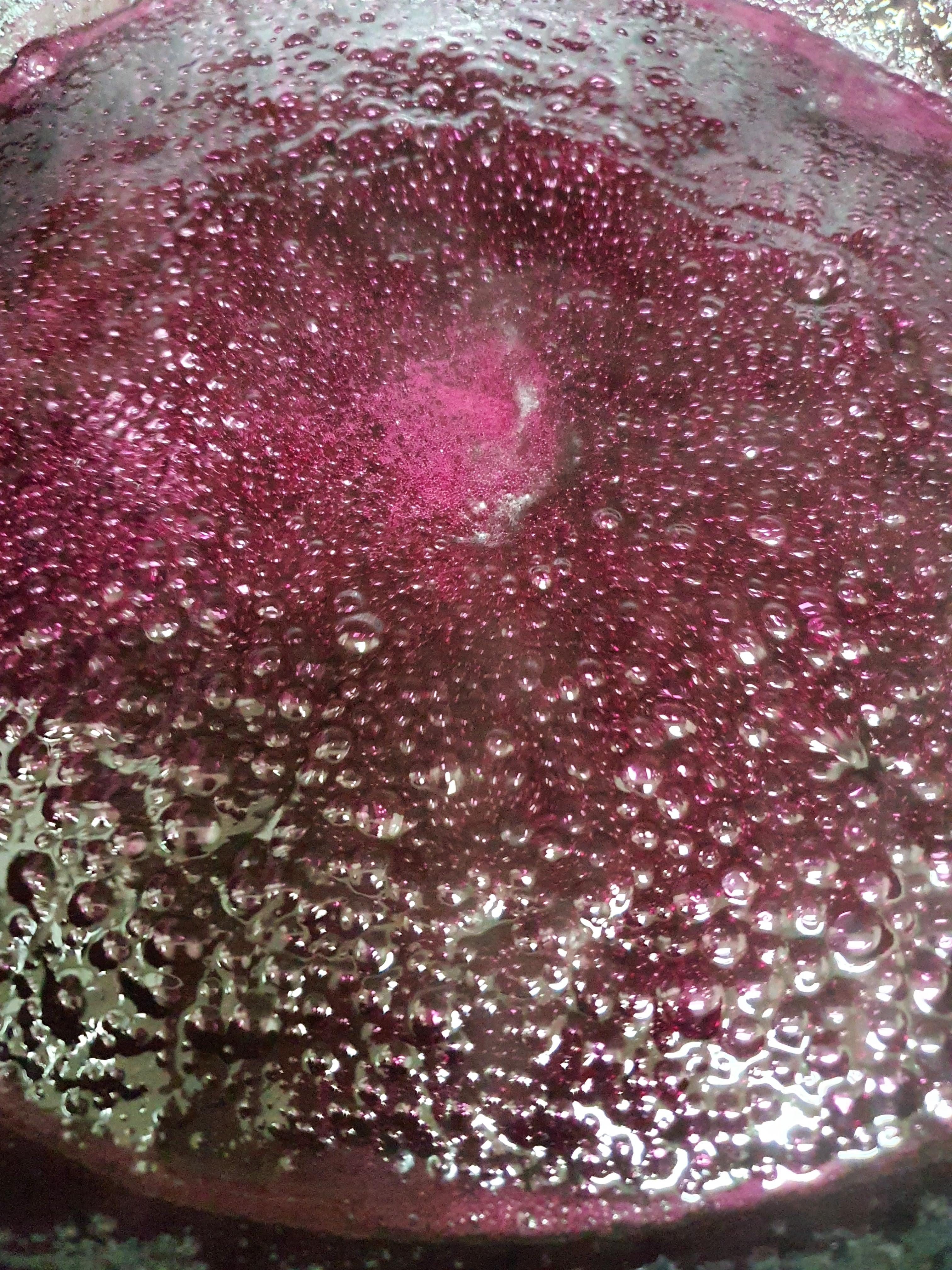 끓이는 동안 구멍이 숭숭 뚫린 조리 도구를 이용해 포도알을 눌러주면 이렇게 순식간에 포도물이 생깁니다.