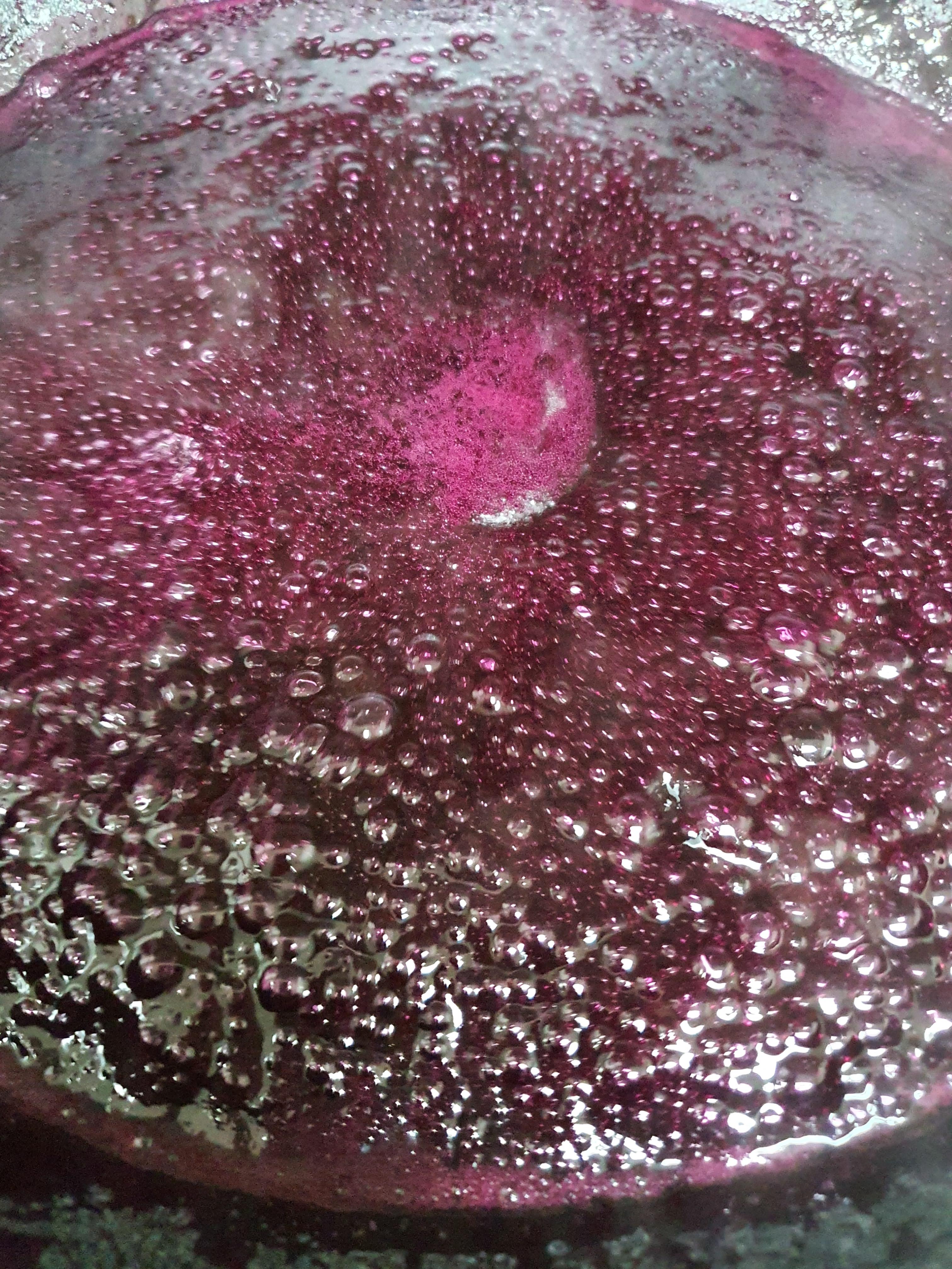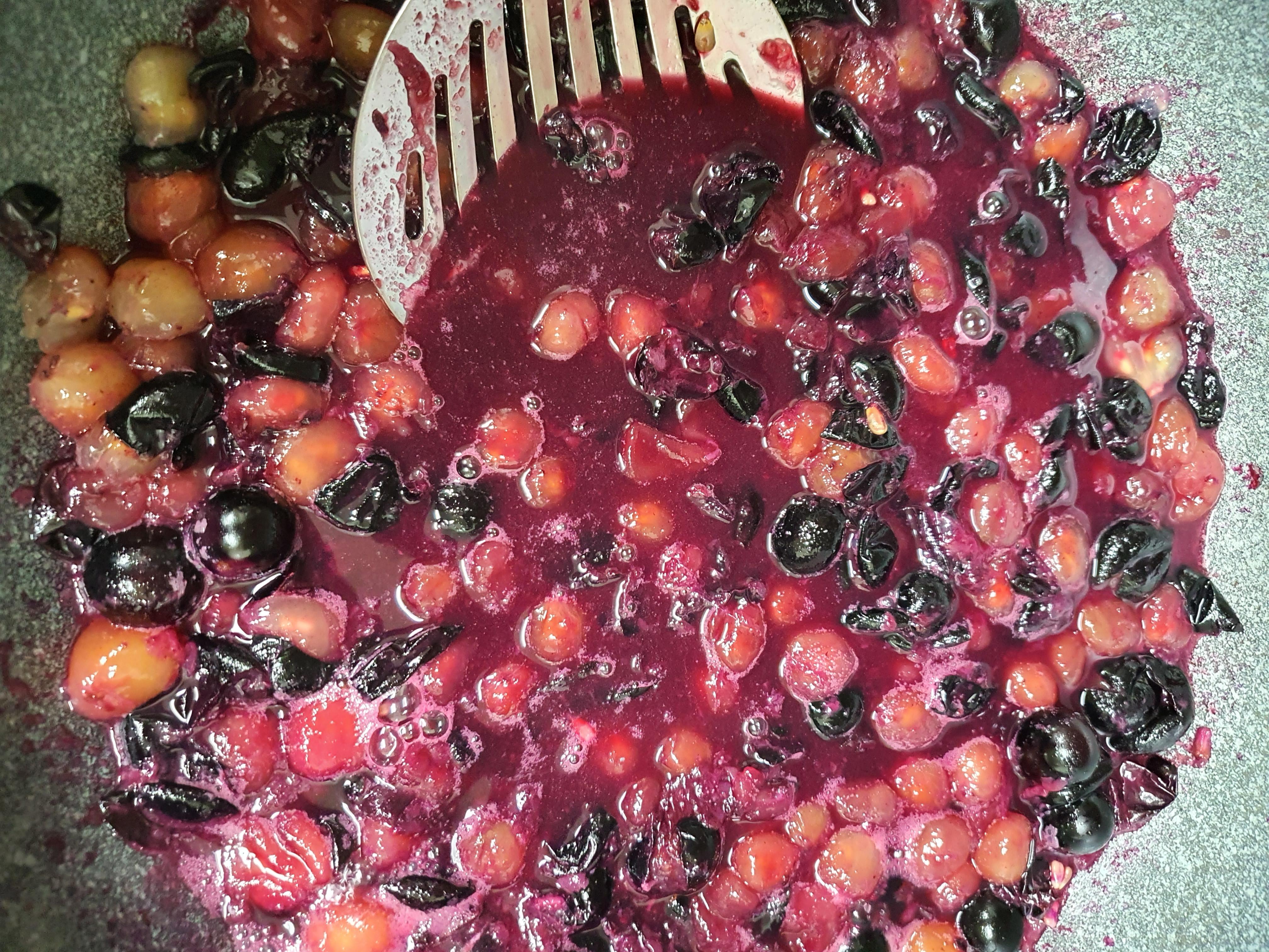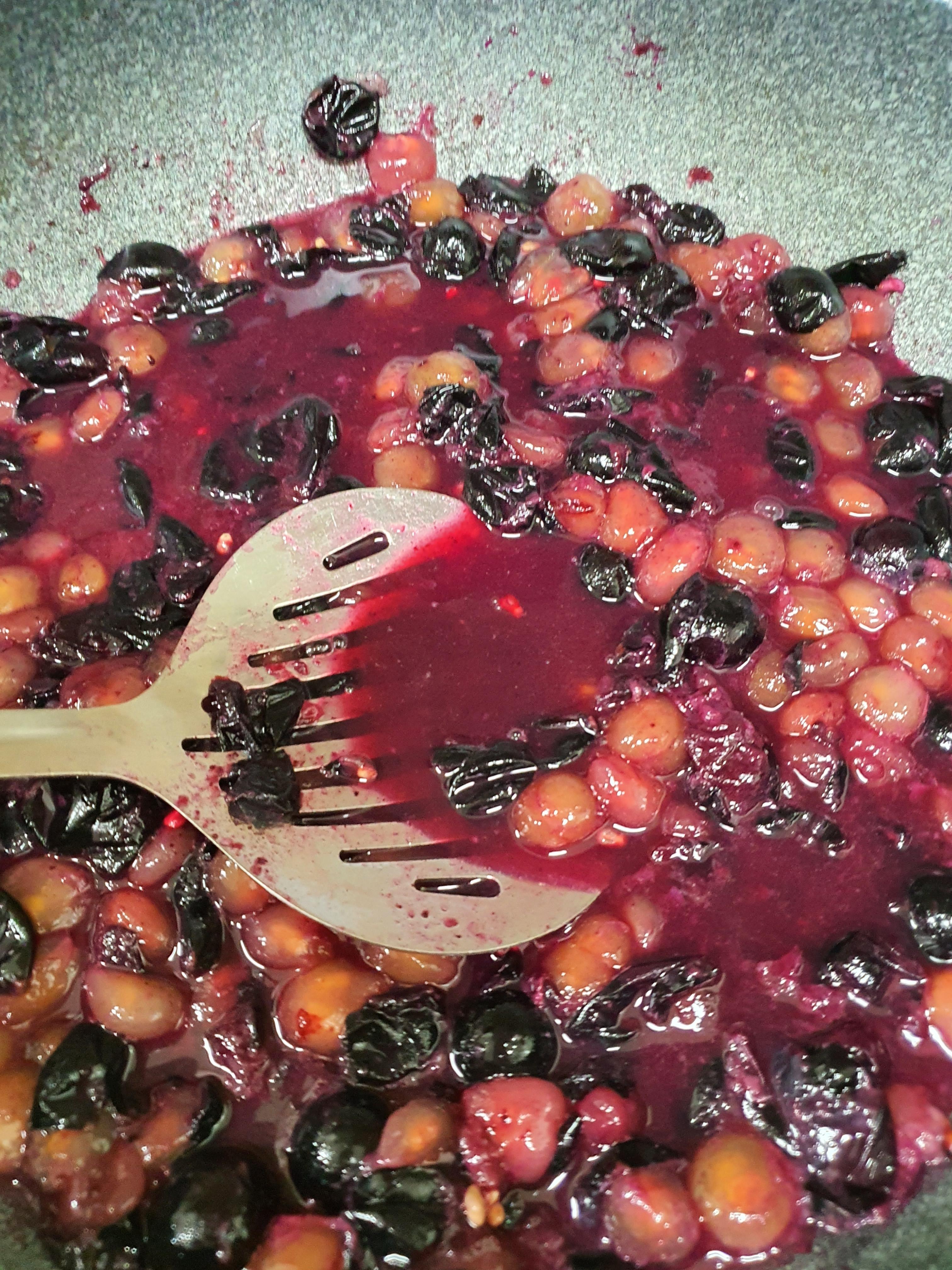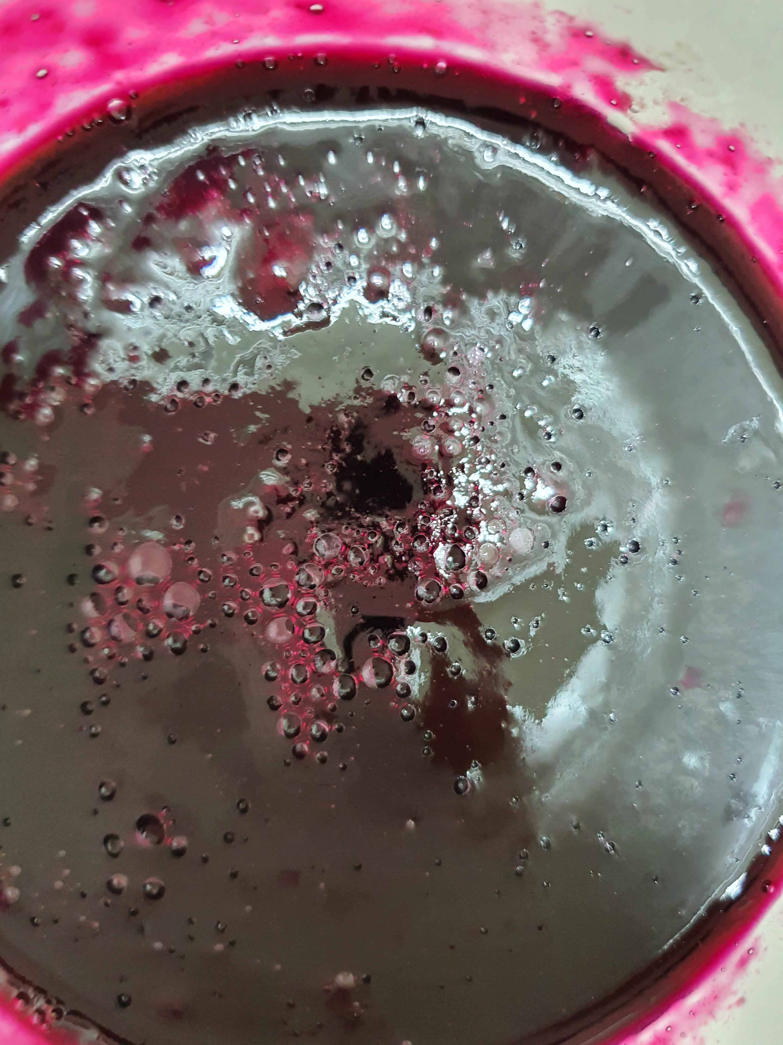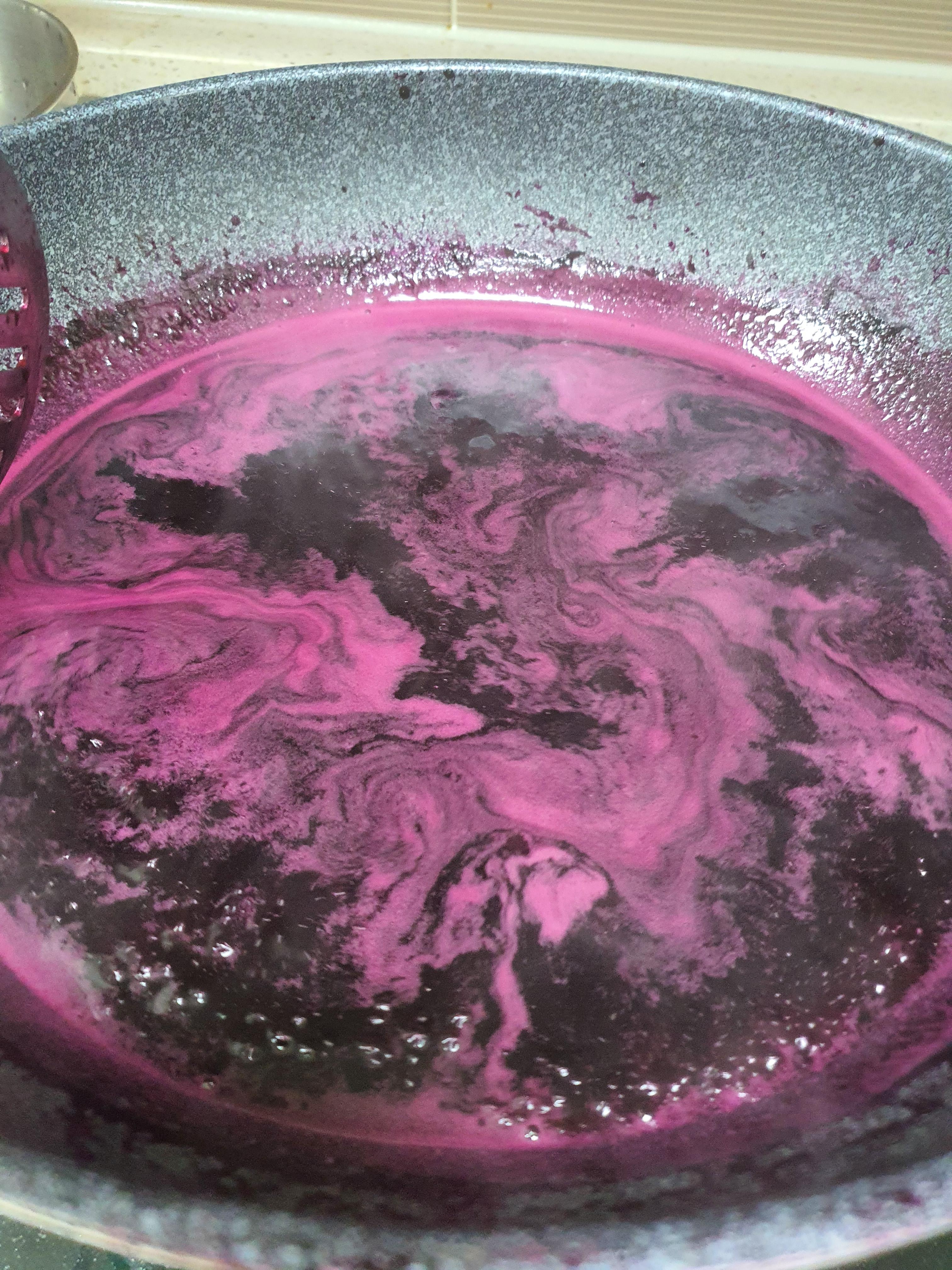 끓이는 동안 구멍이 숭숭 뚫린 조리 도구를 이용해 포도알을 눌러주면 이렇게 순식간에 포도물이 생깁니다.