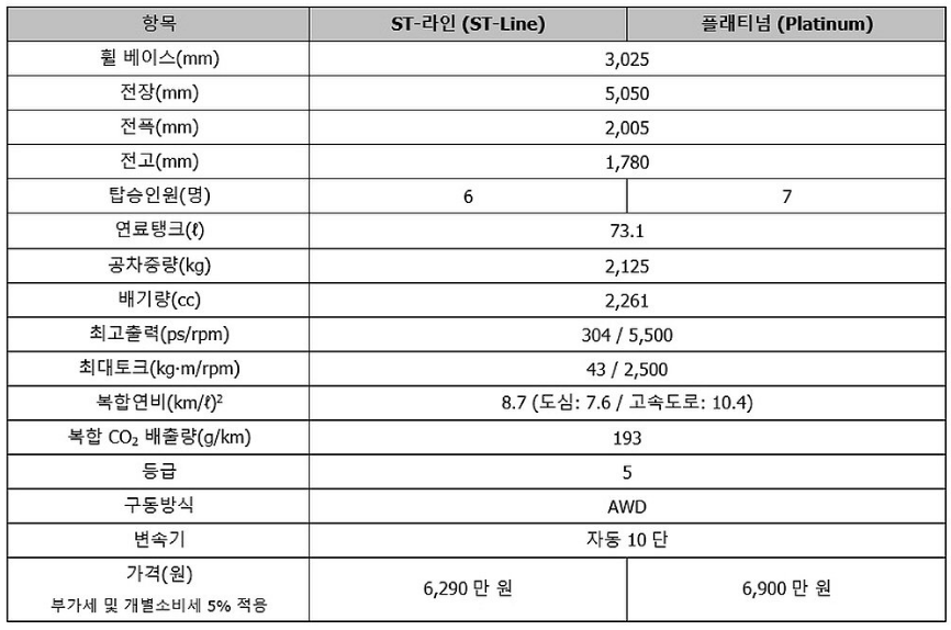 외관 디자인에서는 ST-라인에 스포트한 그릴 패턴과 레드 캘리퍼, 21인치 휠이 적용됩니다. 플래티넘은 오히려 20인치 휠입니다. 또한 ST-라인은 2열 독립형 시트로 구성된 6인승, 플래티넘은 2열 벤치형 시트의 7인승 모델입니다. 새로운 상품구성인데, 개별 트림의 장점이 있습니다.