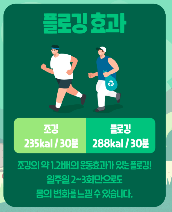 30분 기준 조깅은 235kal, 플로깅은 288kal가 소모된다고 합니다.