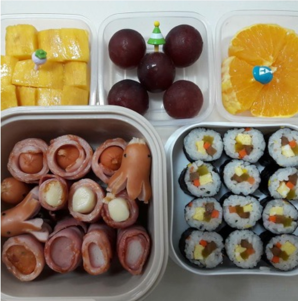 뭐 꼬마 김밥은 모두들 간단하게 쌀 수 있을 것 같습니다. 거기에 계란만 하나 더 추가해주거나 김치를 작게 잘라 넣어주면 좋아했습니다.