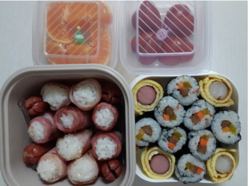 뭐 꼬마 김밥은 모두들 간단하게 쌀 수 있을 것 같습니다. 거기에 계란만 하나 더 추가해주거나 김치를 작게 잘라 넣어주면 좋아했습니다.