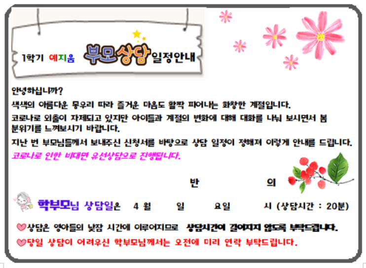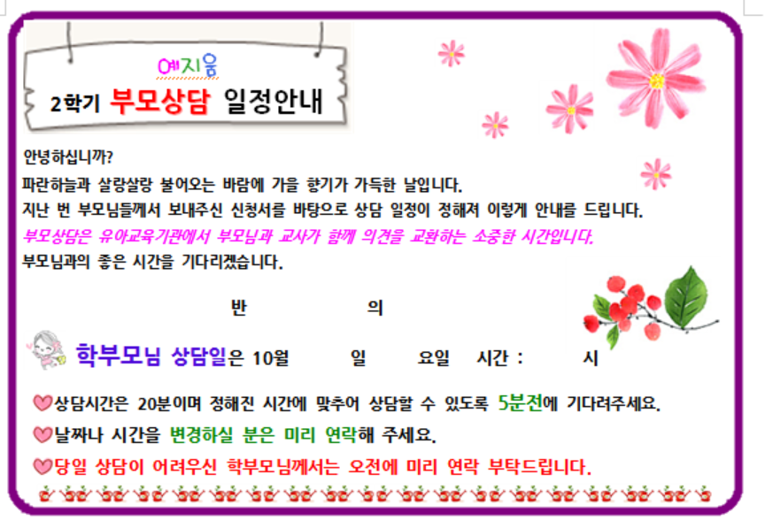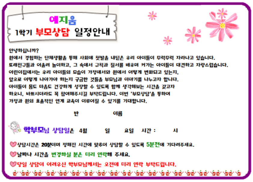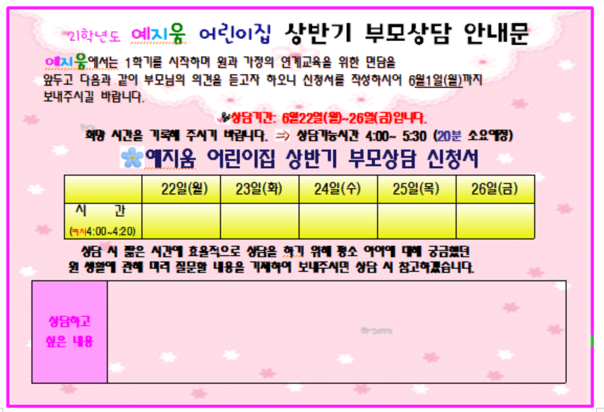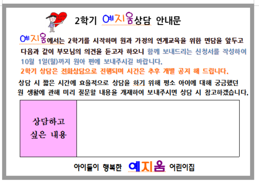 20학년도 예지움 어린이집 상반기 부모상담 안내문