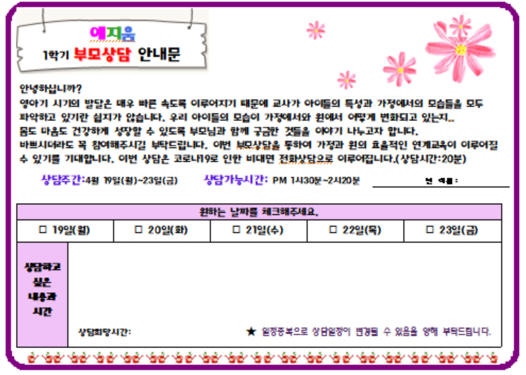 예지움에서는 1학기를 시작하며 원과 가정의 연계교육을 위한 면담을