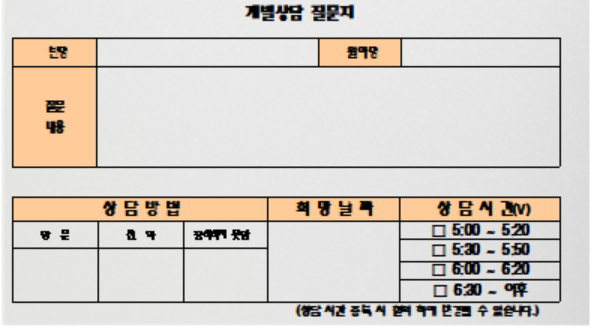 원 생활에 관해 미리 질문할 내용을 기재하여 보내주시면 상담 시 참고하겠습니다.