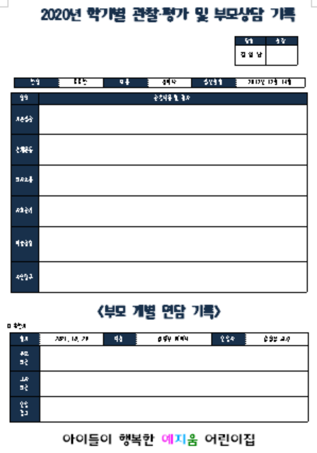 오늘은 어린이집 학부모 상담 안내문과 그에 따른 학부모 상담 질문지 그리고, 마지막으로 학부모 상담 기록지겸 분기별로 꼭 기록해야하는 영아 영역별 총평까지 이 모든 서류를 모두 올려봅니다.