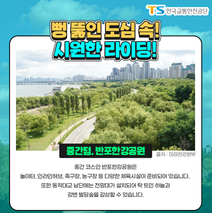 중간 코스인 반포한강공원은 놀이터, 인라인허브, 축구장, 농구장 등 다양한 체육시설이 준비되어 있습니다. 또한 동작대교 남단에는 전망대가 설치되어 탁 트인 하늘과 강변 빌딩숲을 감상할 수 있습니다.