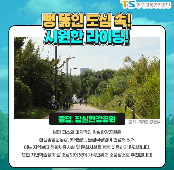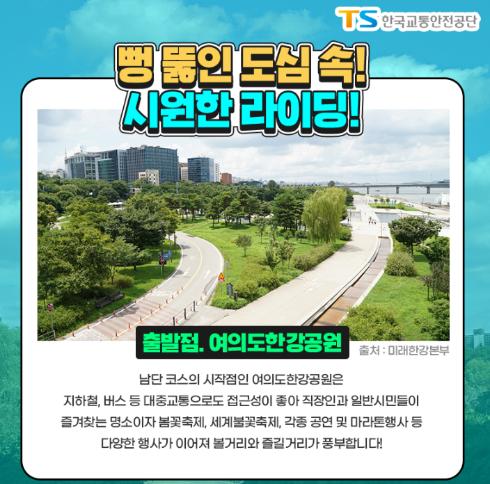 남단 코스의 시작점인 여의도 한강공원은 지하철, 버스 등 대중교통으로도 접근성이 좋아 직장인과 일반 시민들이 즐겨 찾는 명소이자 봄꽃축제, 세계불꽃축제, 각종 공연 및 마라톤행사 등 다양한 행사가 이어져 볼거리와 즐길거리가 풍부합니다.