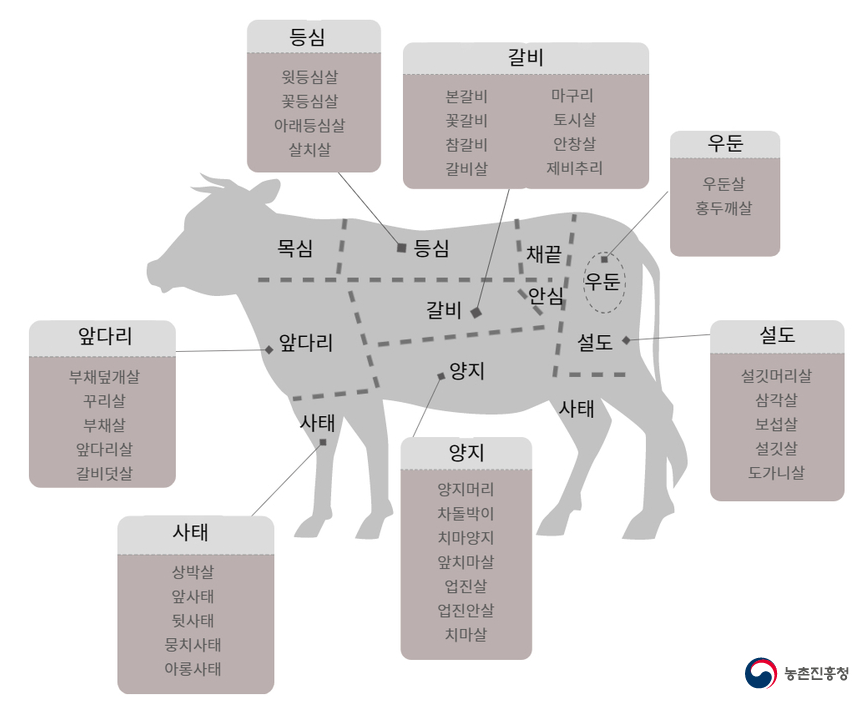 한우는 부위마다 고유의 특징이 있는데, 크게는 10개 부위로, 작게는 39개 부위로 나뉜다고 합니다.(39개 소부분할 부위 중 양이 매우 적거나 겹치는 7개 부위는 제외)