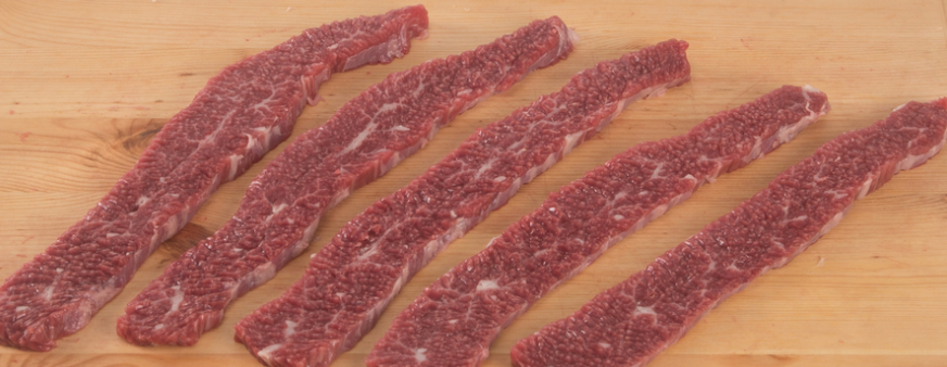 산적용 고기로는 살코기가 많고 지방이 적은 '우둔'과 '설도'가 적합한데, 근막이 없고 고깃결이 균일한 것을 고르되, 얇게 썬 다음 고깃결과 직각으로 칼집을 내주는 것이 좋습니다.