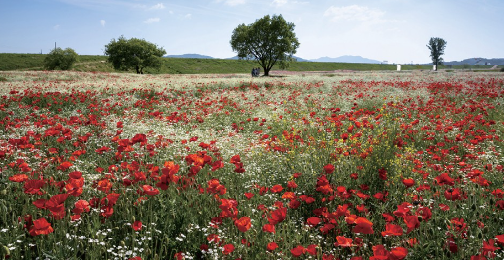 경상남도 함안군은 덕유산에서 발원한 남강이 산청, 진주를 거쳐 낙동강과 합수되는 지점에 자리합니다. 함안은 최근 몇 년 사이 여행자들에게 주목받기 시작했습니다. 남강변에 조성된 악양둑방의 화사한 꽃길이 SNS 인증샷 명소로 주목받고 있기 때문입니다. 이 무렵이면 눈이 아리도록 붉은 꽃양귀비와 푸른 빛깔 수레국화기가 컬러의 대비를 이루며 여행자들의 가슴을 뛰게 만듭니다.