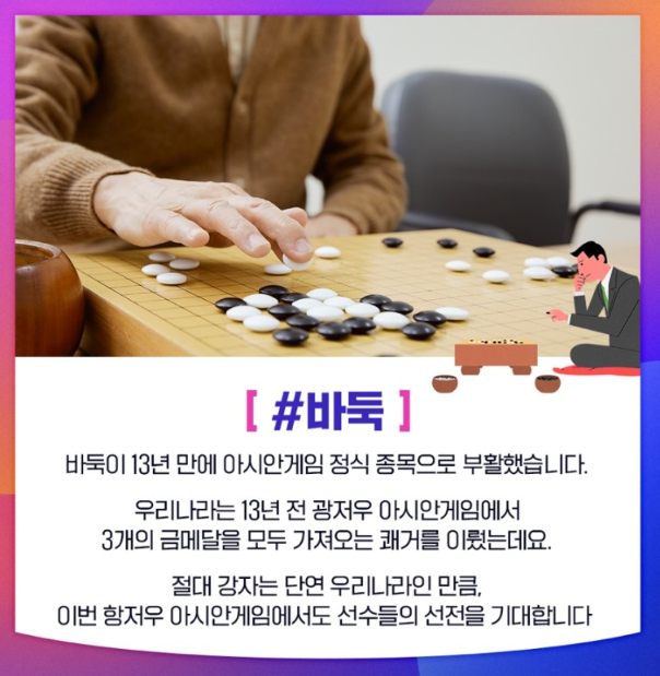 바둑이 13년 만에 아시안게임 정식 종목으로 부활했습니다. 우리나라는 13년 전 광저우 아시안게임에서 3개의 금메달을 모두 가져오는 쾌거를 이뤘습니다. 절대 강자는 단연 우리나라인 만큼, 이번 황저우 아시안게임에서도 선수들의 선전을 기대합니다.