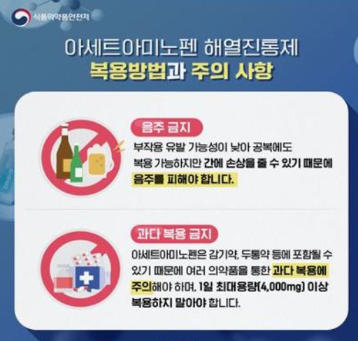 아세트아미노펜은 1일 최대용량(4,000mg) 이상 복용하지 말아야 하며, 감기약, 두통약 등 다른 의약품에도 아세트아미노펜 성분이 포함되어 있을 수 있어 과다복용에 주의해야 한다고 합니다.