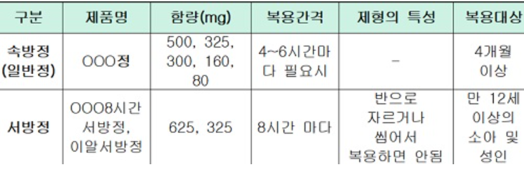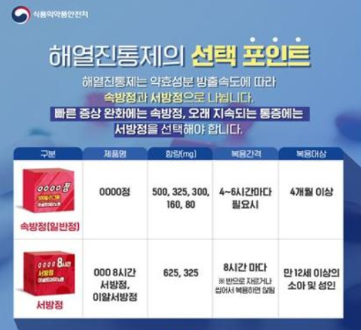 아세트아미노펜 제제는 약효성분이 빠르게 방출되는 속방정과 약효 성분이 서서히 불출되는 서방정이 있으므로 빠른 증상 완화에서 속방정을, 오래 지속되는 틍증의 완화에는 서방정을 선택·복용해야 한다고 합니다.