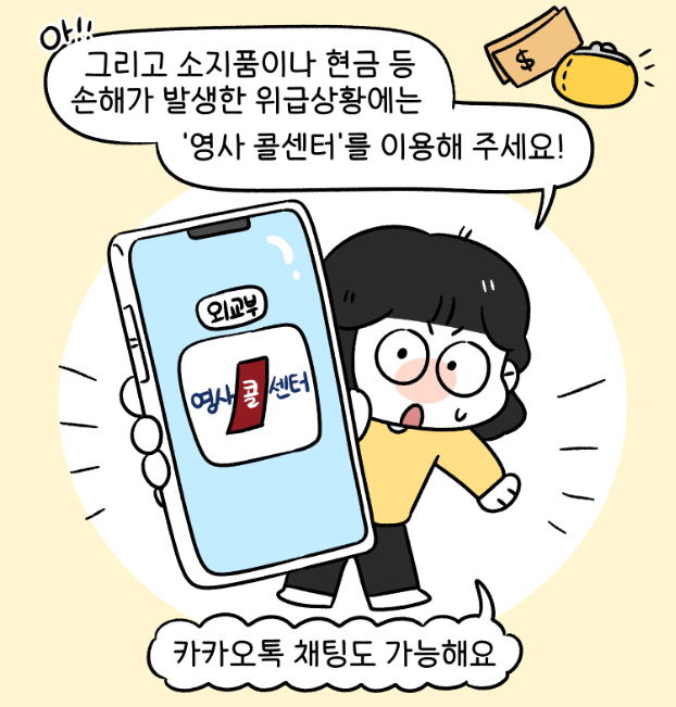 소지품, 현금 등 손해가 발생한 위급상황에는 '영사 콜센터'를 이용하면 됩니다.