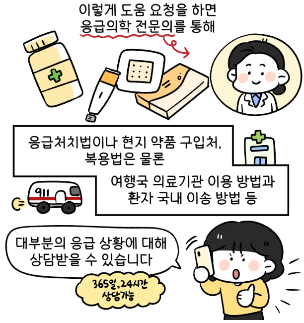 응급처치법, 현지 약품 구입처, 복용법은 물론 여행국 의료기관 이용 방법, 환자 국내 이송 방법 등을 응급의학 전문의 통해 상담 가능합니다.