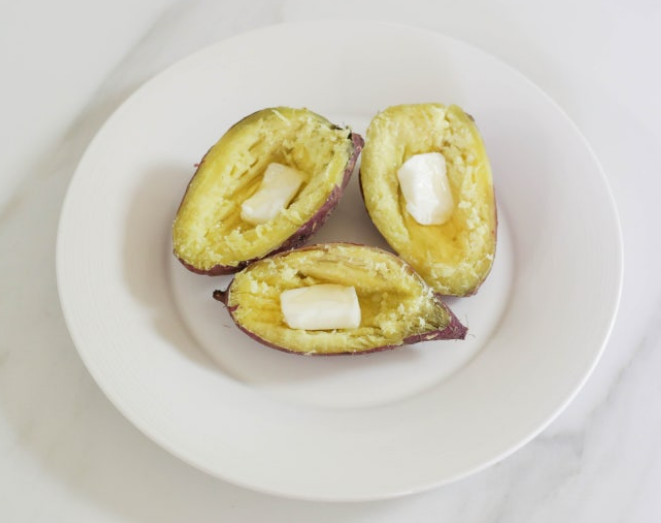 다이어트와 미용에 좋은 음식으로 고구마만한 것이 없습니다. 섬유소가 풍부하여 변비를 예방할 수 있고, 높은 포만감을 줍니다. 장 건강에도 좋으며, 콜레스테롤을 낮추는 데도 도움을 줍니다. 고구마 속의 노란색을 띠는 베타카로틴 성분은 면역력 증진에 효과적이라고 합니다. 게다가 고구마는 대표적인 알칼리성 식품으로 노화를 방지하며 만성 질환을 예방하는 효능이 있다고 합니다.