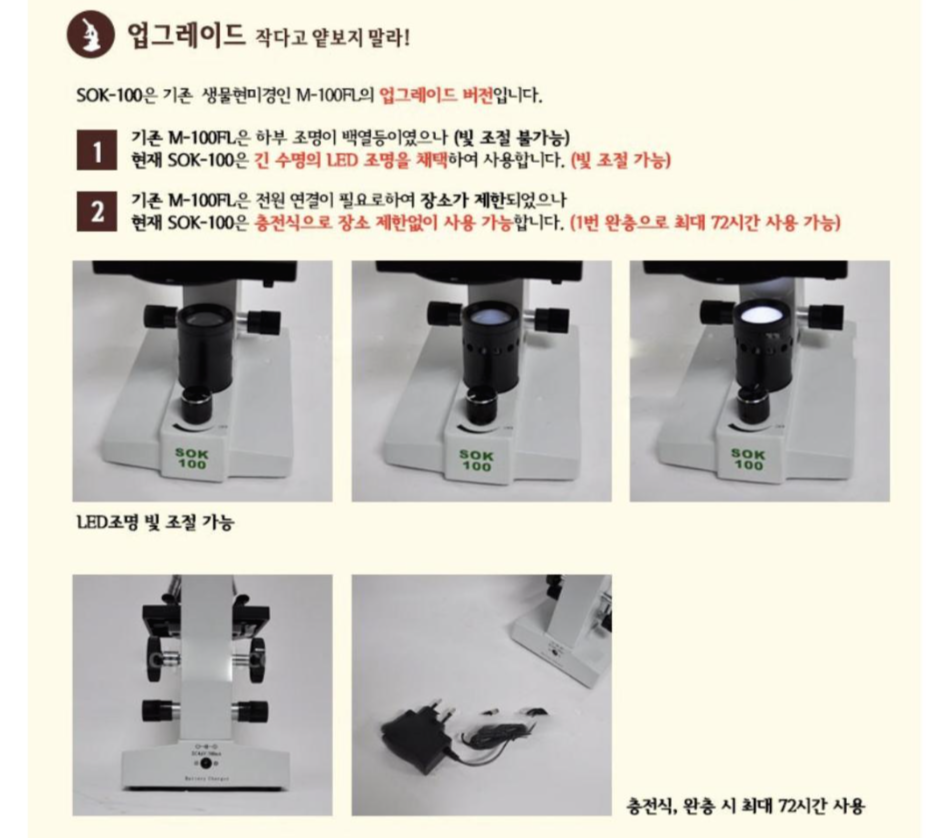 하지만, 판매 상품설명서에 따르면 M-100FL는 하부 조명이 백열등이였으나 현재는 긴 수명의 LED 조명으로 바꾸었고 기존 M-100FL는 전원 연결이 필요하여 장소가 제한되었으나 현재 SOK-100은 충전식으로 장소 제한 없이 사용이 가능하다고 합니다.