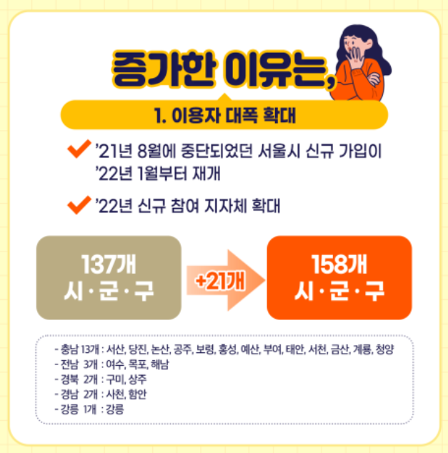'21년 8월부터 예산 부족으로 신규가입이 중단된 서울시의 신규가입이 '22년 1월부터 재개되었고, 참여 지자체가 올해부터 137개에서 158개 시·군·구로 확대되었다고 합니다.
