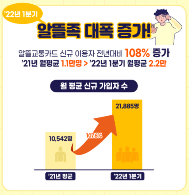 알뜰 교통카드 이용자 '22년 1분기에 65,656명(월평균 21,885명)증가, 전년도 월 평균 10,542명 대비 대폭 증가(107.6%) 했다고 합니다.