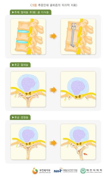 수술 적 치료 방법에는 2가지가 있는데 목 앞쪽으로 접근하여 척수 신경을 누르는 골화된 후종인대를 제거하여 직접적으로 신경을 감압시켜주는 방법과 목 뒤쪽으로 접근하여 척수신경관을 넓혀주어서 간접적으로 신경을 감압시켜주는 방법이 있다고 합니다.