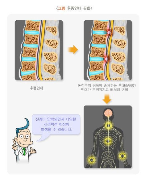 척수병증은 말 그대로 척수에 병이 생겼다는 말로 좁은 신경관 안에 후종인대골화증이 자라면서 척수 신경을 누르면서 발생하는 증상이라고 합니다.