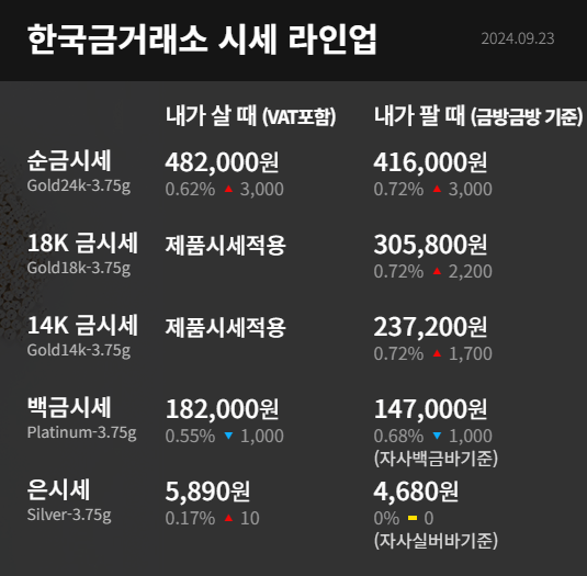 내가 팔때는 24K금시세 기준 3.75g당 전날 마감 시세보다 3,000원 상승한 416,000원이며, 18K 금시세는 3.75g당 전날 마감시세보다 2,200원 상승한 305,800원, 14K 금시세는 3.75g 전날 마감 기준 1,700원 상승한 237,000원입니다.