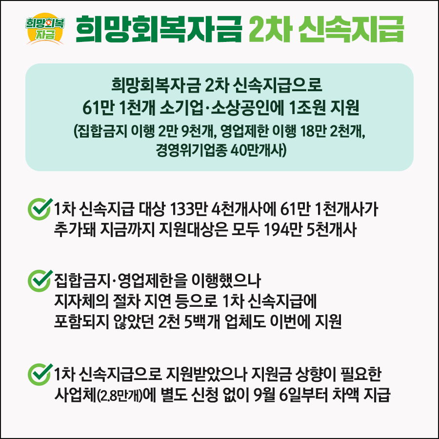 또한, 1차 신속지급으로 지원받았으나 지원금 상향이 필요한 사업체(2.8만개)에게는 별도 신청없이 9월 6일부터 차액이 지급된다고 합니다.