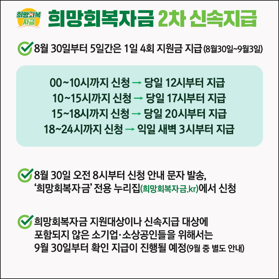 최대한 빠른 지원을 위해 8월 30일부터 5일간 (8월30~9월3일)은 1일 4회 지원금이 지급되며, 18시까지만 신청하면 당일에 지급을 받게 된다고 합니다.